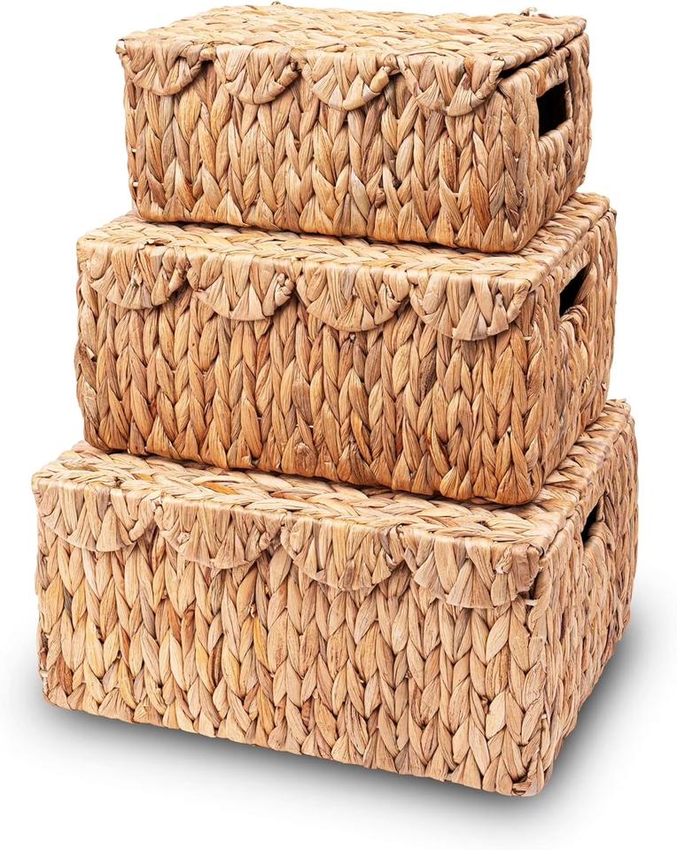 Nombre:Juego de 3 cajas rectangulares con tapas tejidas de conchas marinas.
