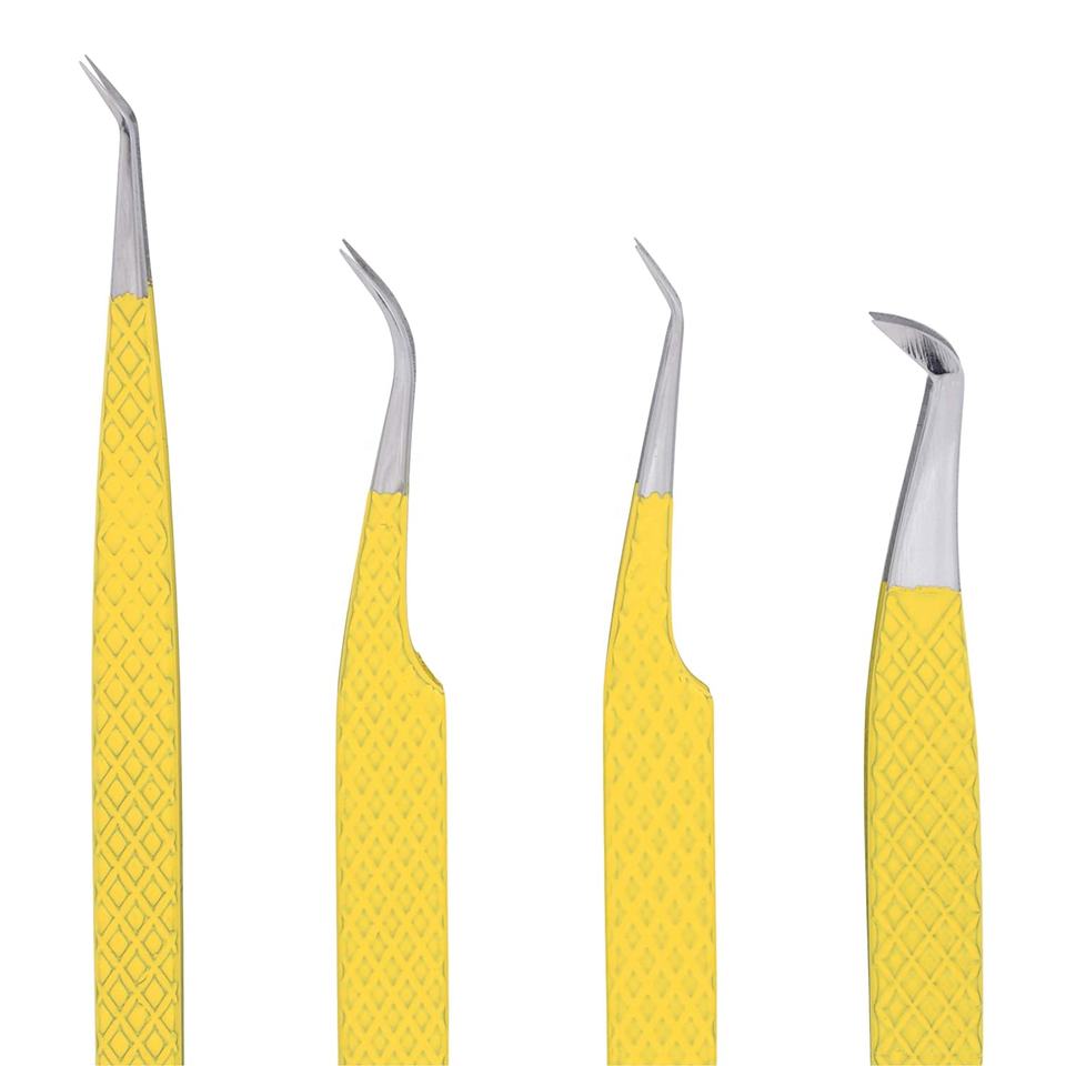 Juego de 4 pinzas para extensiones de pestañas con agarre de diamante de acero japonés amarillo, Punta puntiaguda de acero inoxidable para suministro de pestañas