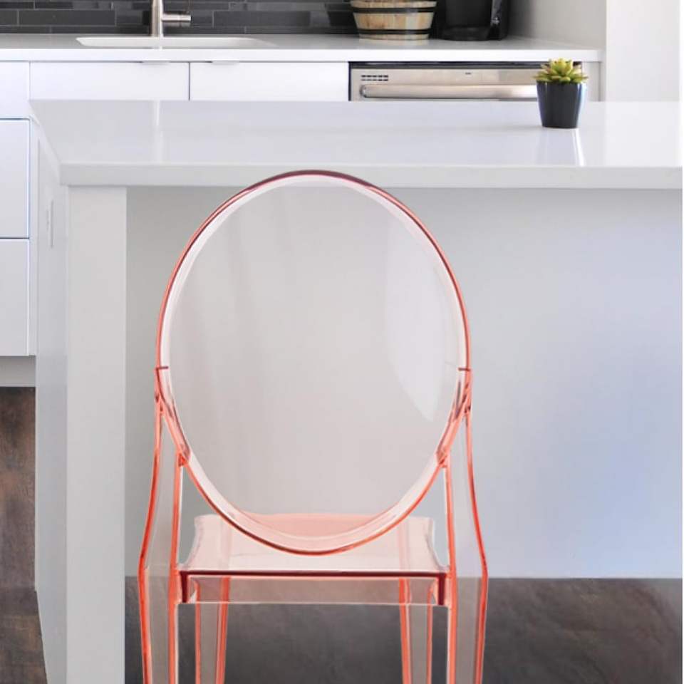 Juego de 4 sillas laterales modernas transparentes de color rosa transparente con acento fantasma con respaldo apilable para comedor, restaurante, eventos