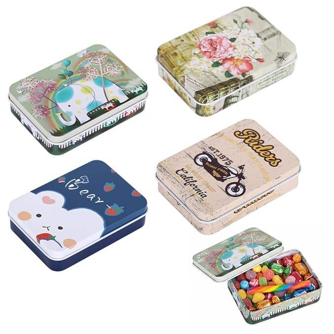 Juego de 4 Recipientes Rectangulares de Metal Multicolor con Acabado Brillante, Cajas de Almacenamiento Metálicas Resistentes con Diseños de Artículos Electrónicos
