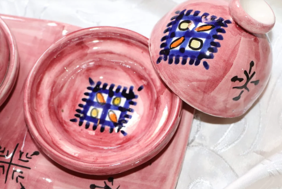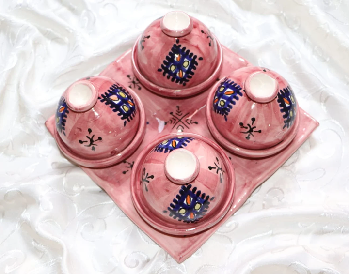 Lindo conjunto marroquí rosa de cuatro mini tajines de cerámica con una bandejaModo