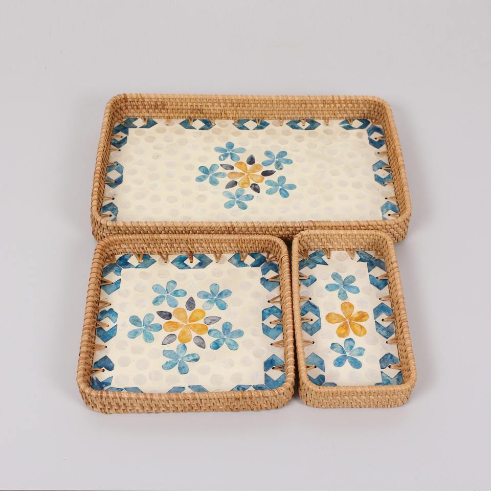 Juego de bandeja MOP de ratán de alta calidad, bandejas para servir de nácar, mesita de noche, decoración de cocina