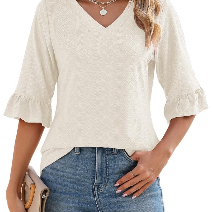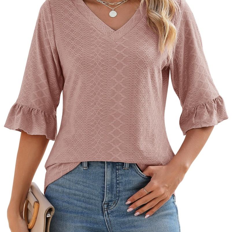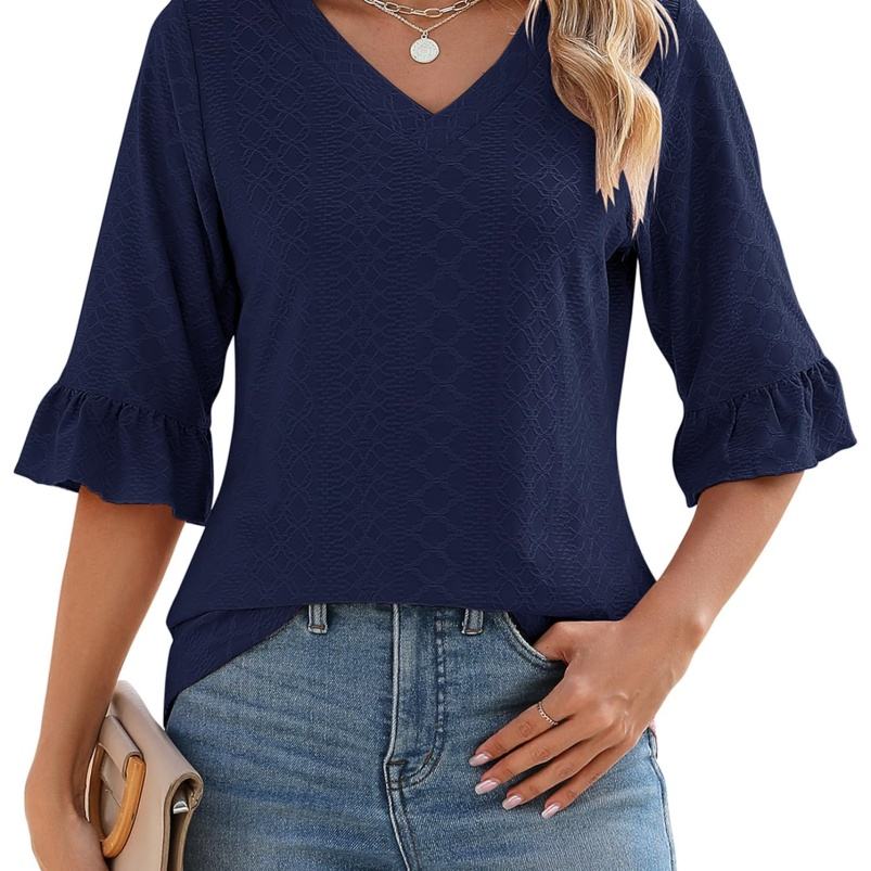 Top de verano de manga de siete pulgadas para mujer, Camiseta holgada de moda con cuello en V y ojales, cintura plisada informal, estampado de logotipo hecho de poliéster