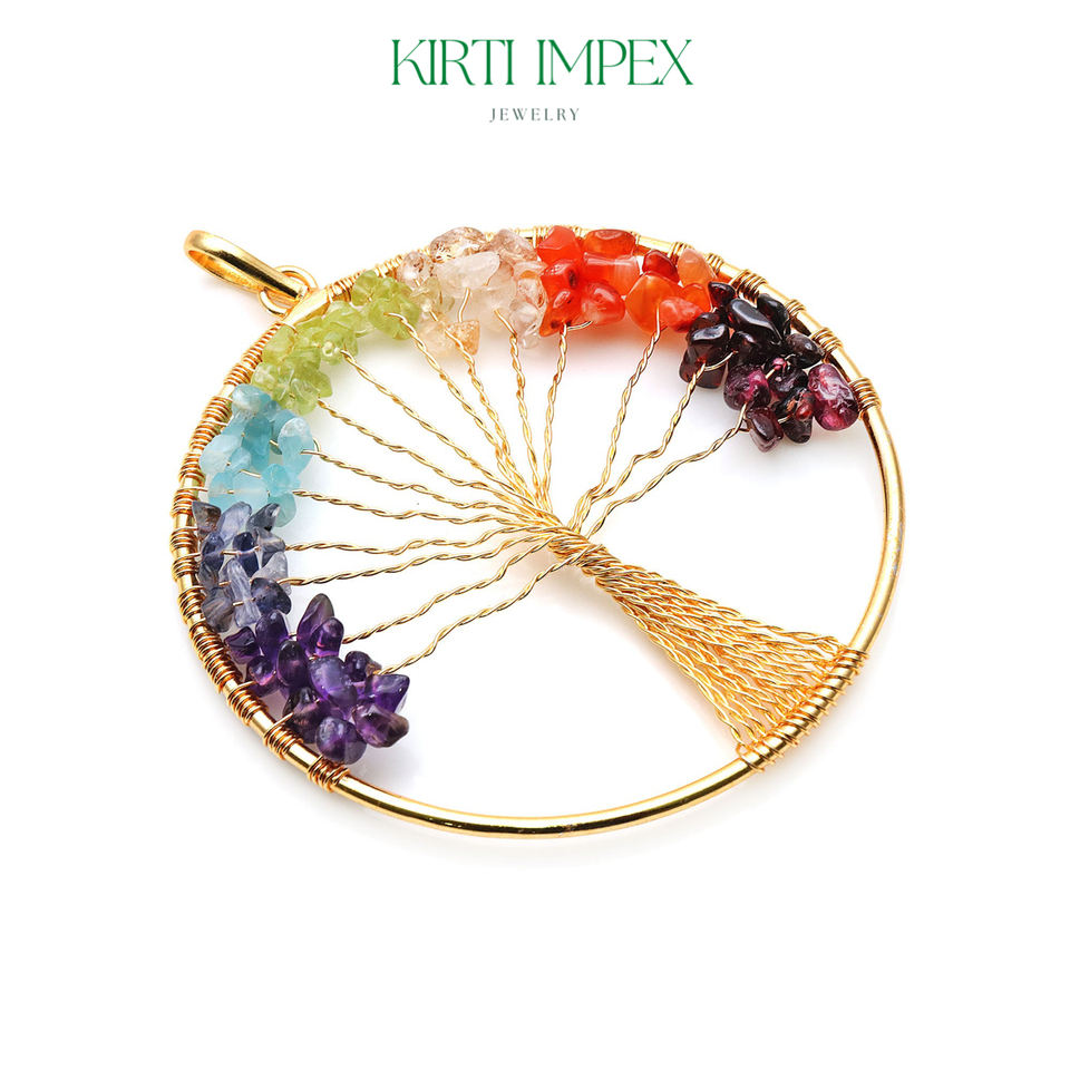 Colgante Árbol de la Vida de los Siete Chakras, Plata/Oro, Alambre Envuelto, Cuarzo Tallado, Piedra Preciosa Única, Estilo Amor, con Virutas Naturales