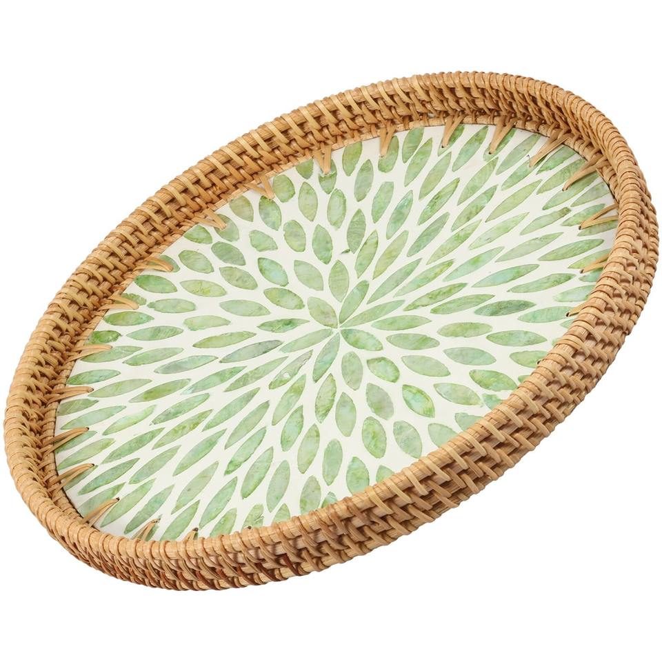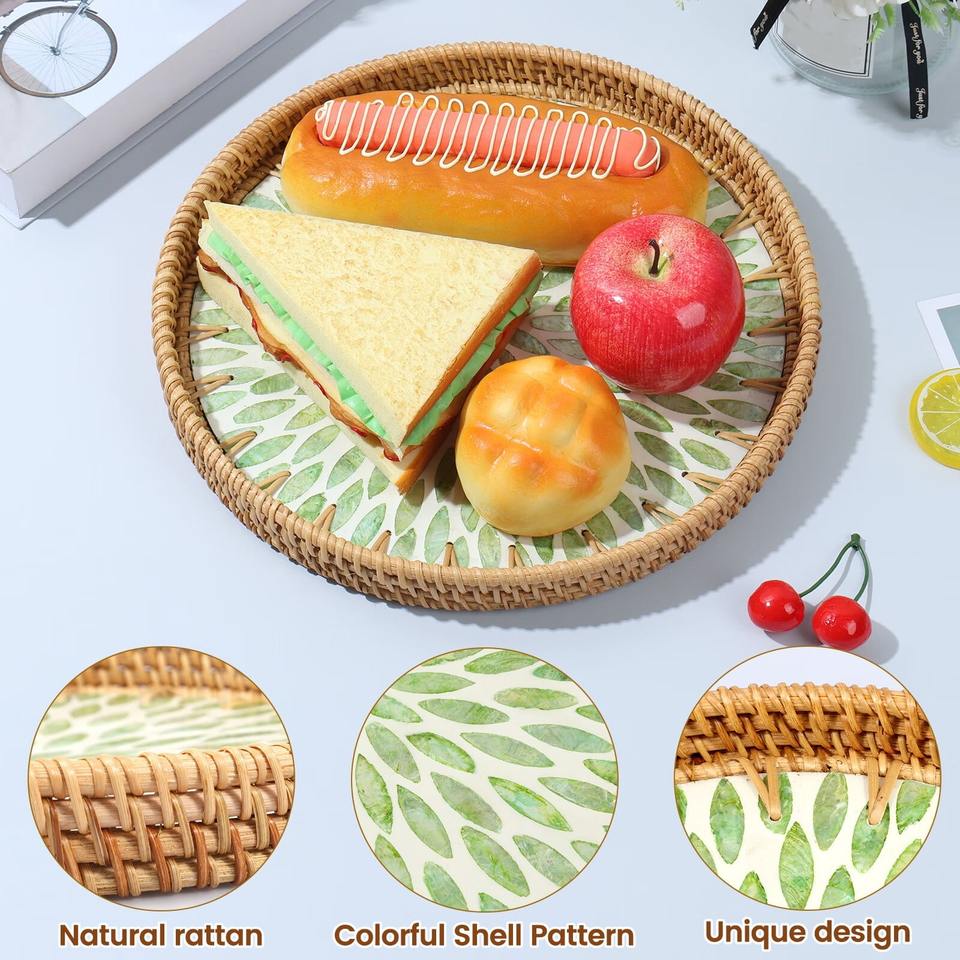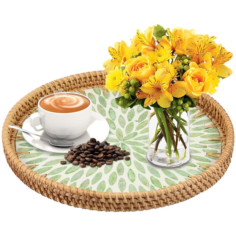 Bandeja de cocina redonda de ratán de varios tamaños con incrustaciones de madreperla tipo de pie para servir alimentos y bebidas
