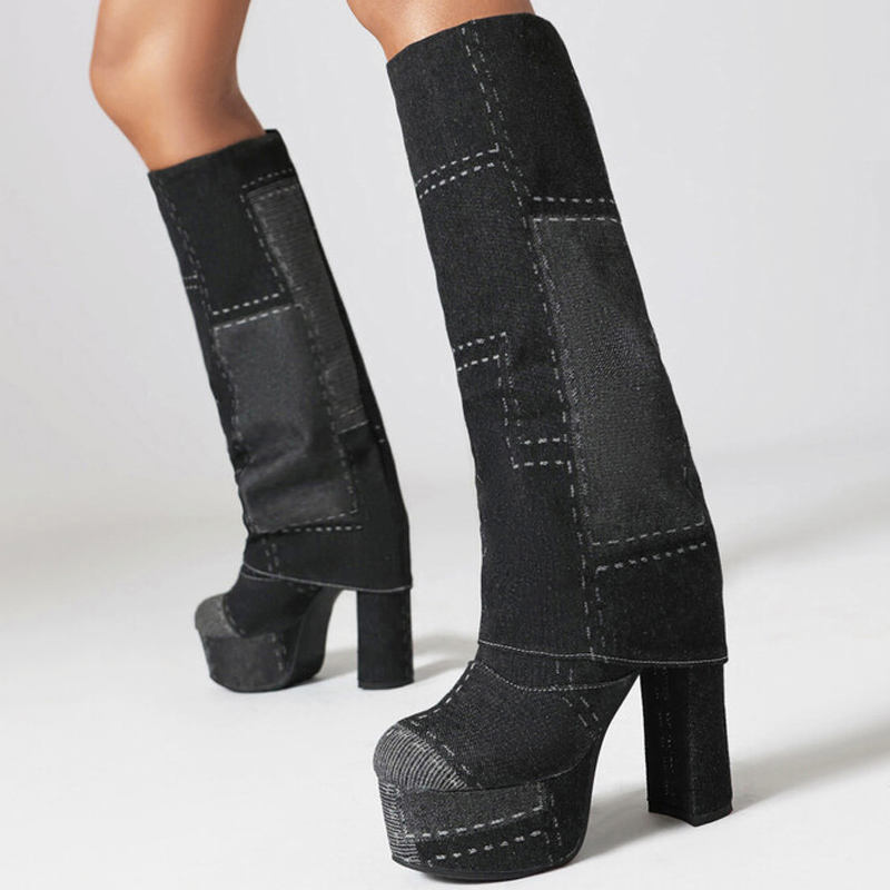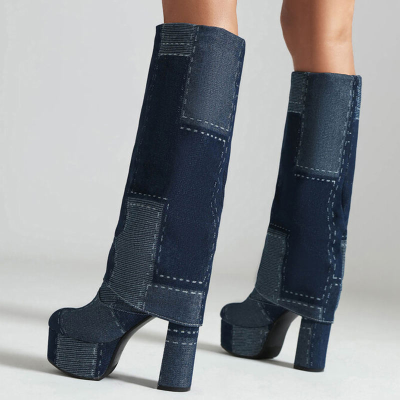 Botines Largos de Mezclilla con Parches para Mujer, Botas Altas hasta la Rodilla, Punta Redonda, Tacones Gruesos, Plataforma, Estilo Pantalón Vaquero