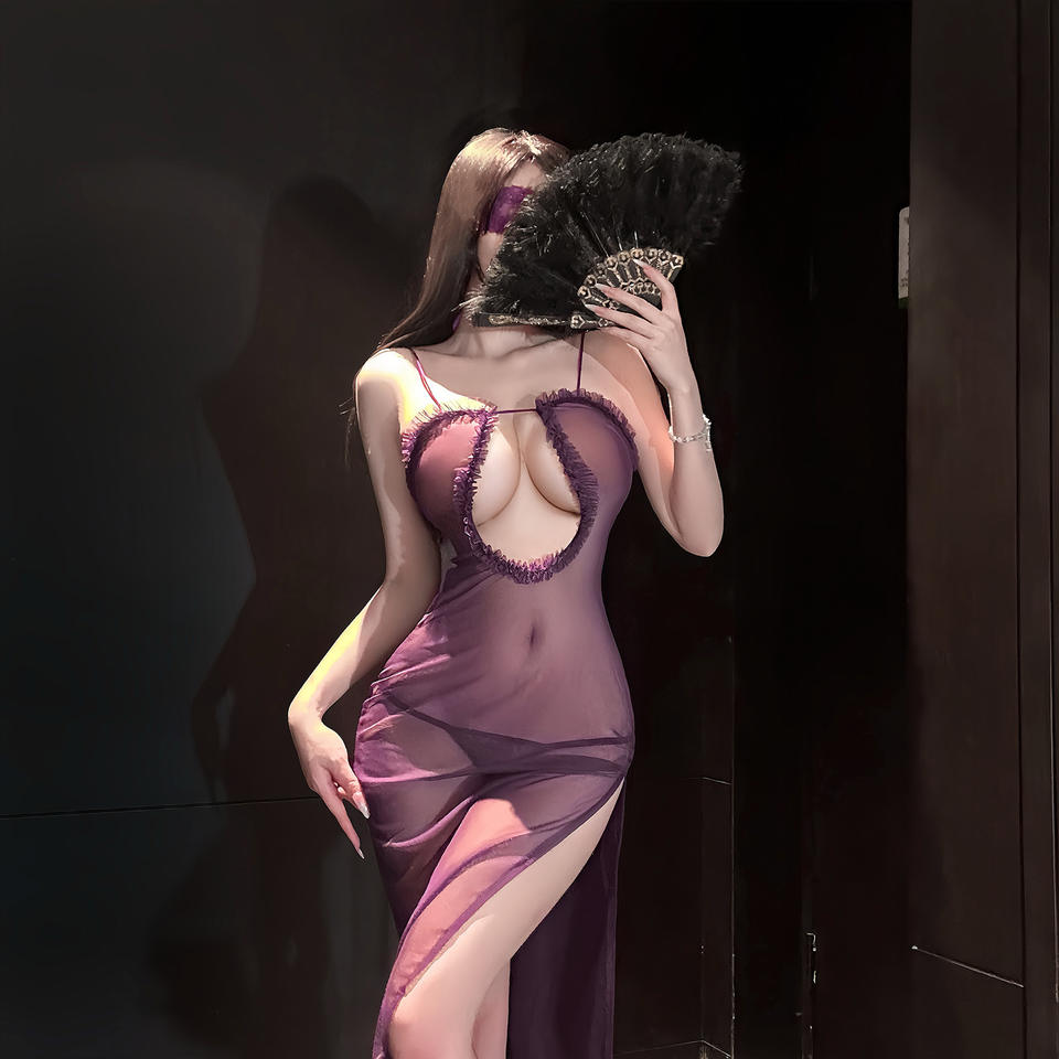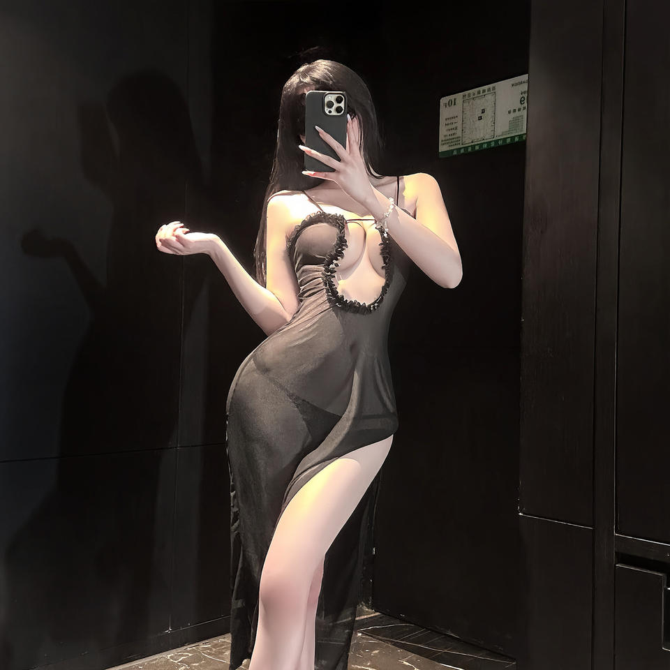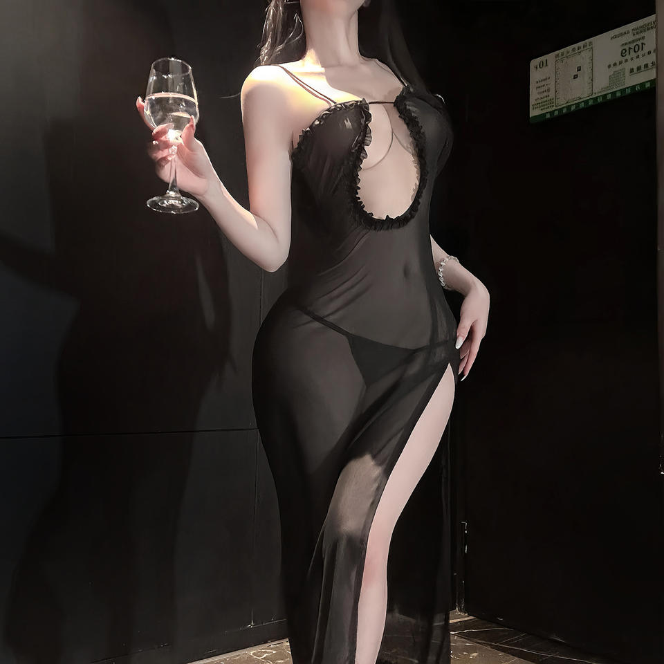 Camisón Largo Negro Sexy, Lencería de Malla Transparente, Vestido con Abertura Alta, Escote Descubierto, Ropa de Dormir Exótica para Mujer, Ropa de Dormir, Regalo de Novia