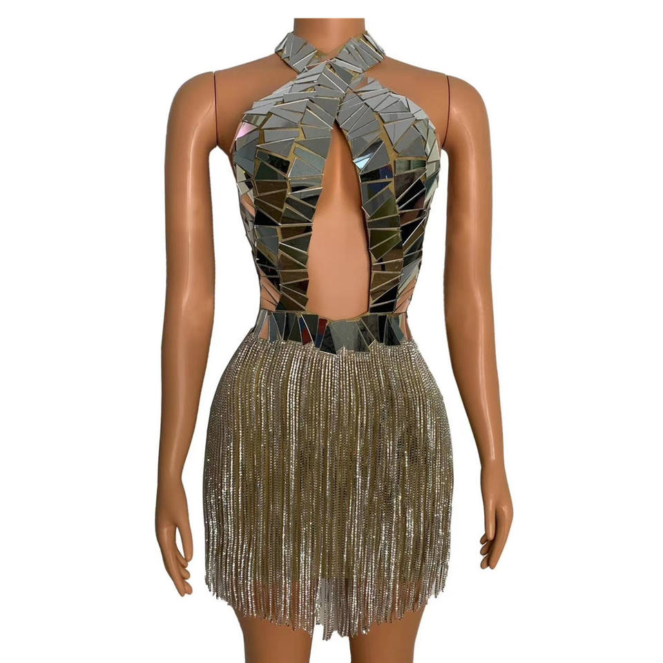 Sexy recortado sin espalda Stripper trajes Ropa de baile espejo lentejuelas borla corto fiesta cóctel vestido mujeres Mini cumpleaños Club vestido