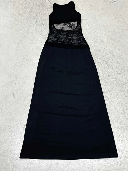 Vestido Largo Sexy con Espalda Descubierta y Transparencias - Estampado Digital Sólido, Cintura Natural, Lavable, Paneles de Encaje Transparentes y Detalles Recortados