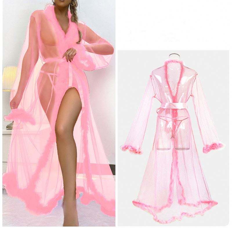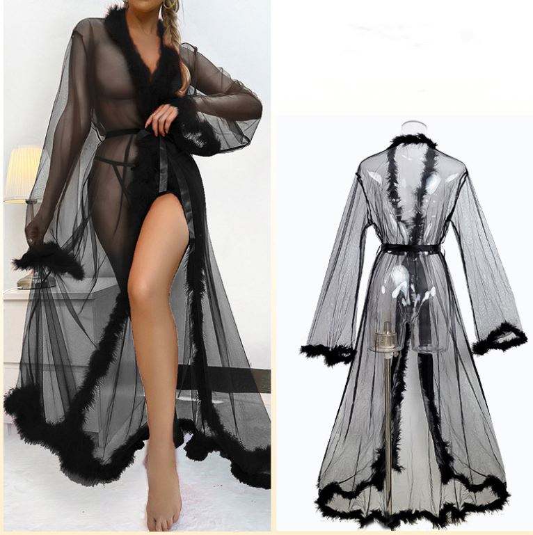 Bata Larga de Malla Sexy con Borde Peludo, Pijama Transparente de Satén con Cintura Elástica, Secado Rápido para Verano