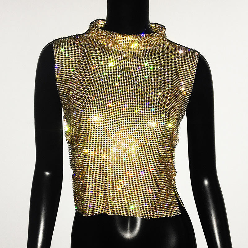 Top corto de fiesta con espalda descubierta y diamantes de imitación para mujer, Camiseta de cuello alto con purpurina, camiseta sin mangas con diamantes y cadena de Metal ajustable para verano
