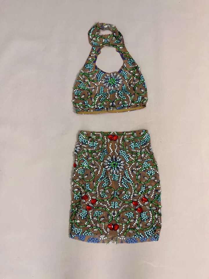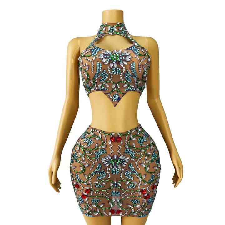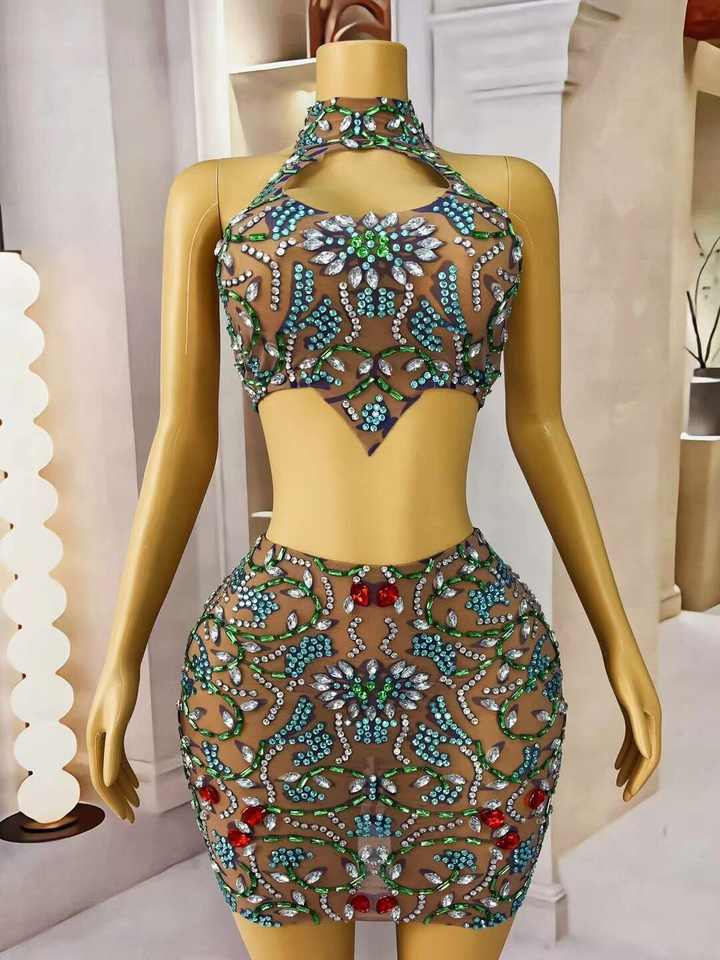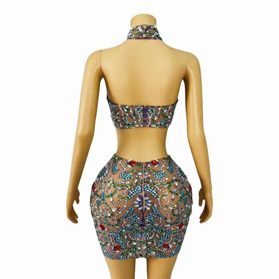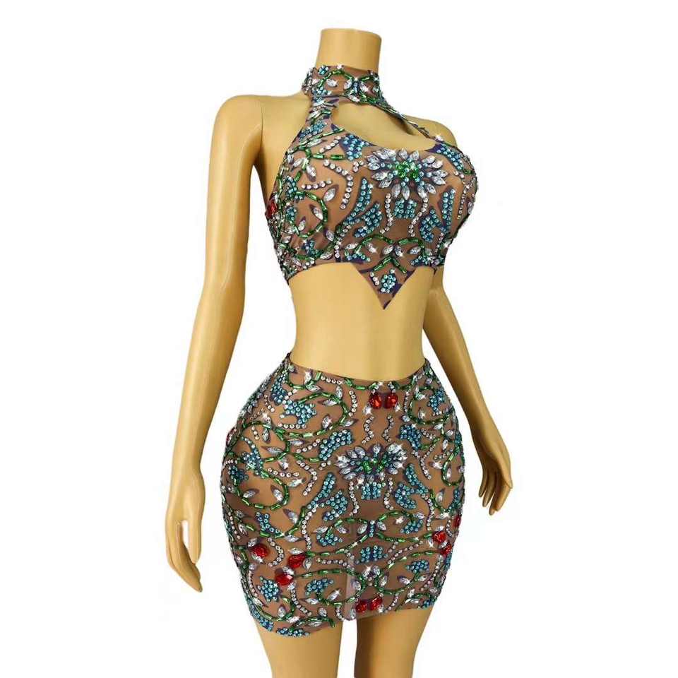 Sexy Rhinestone espalda descubierta Top Mini faldas 2 piezas conjunto cena vestidos de fiesta de cumpleaños vestido envuelto en la cadera mujeres Night Club Wear trajes