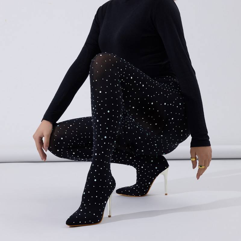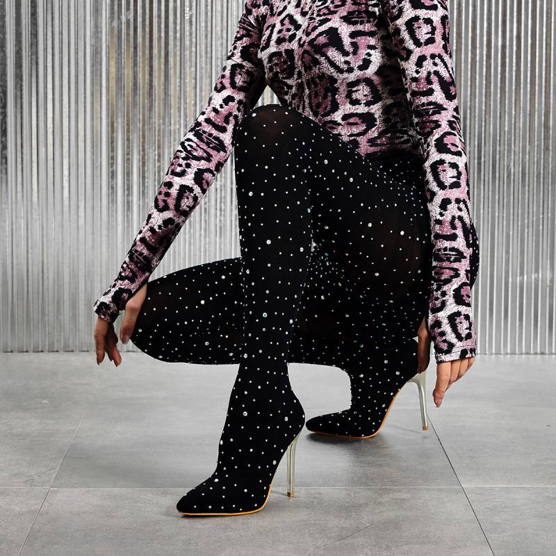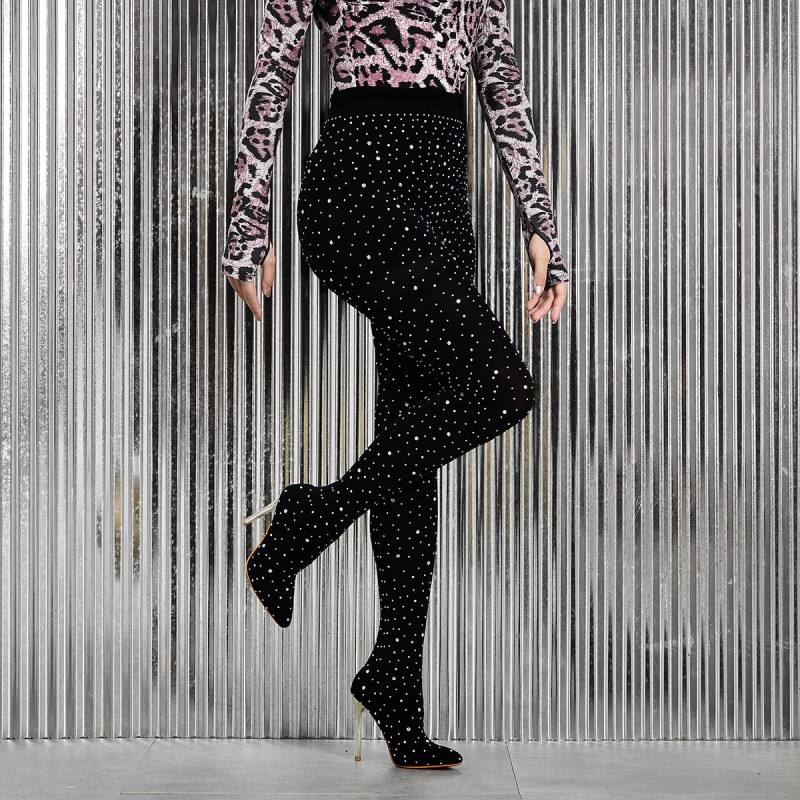Botas de tacón de aguja con diamantes de imitación, sexys, de punta, nuevas 2025, para mujer, pantalones, pantimedias, pantalones hasta el muslo, sobre la rodilla, tipo mono