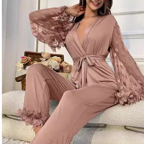 Conjunto de Bata de Lujo con Cinturón de Seda para Mujer, Conjunto de Pijama de Encaje Transparente, Manga con Volantes, Apertura, 2 Piezas, Invierno, 2025, 2017