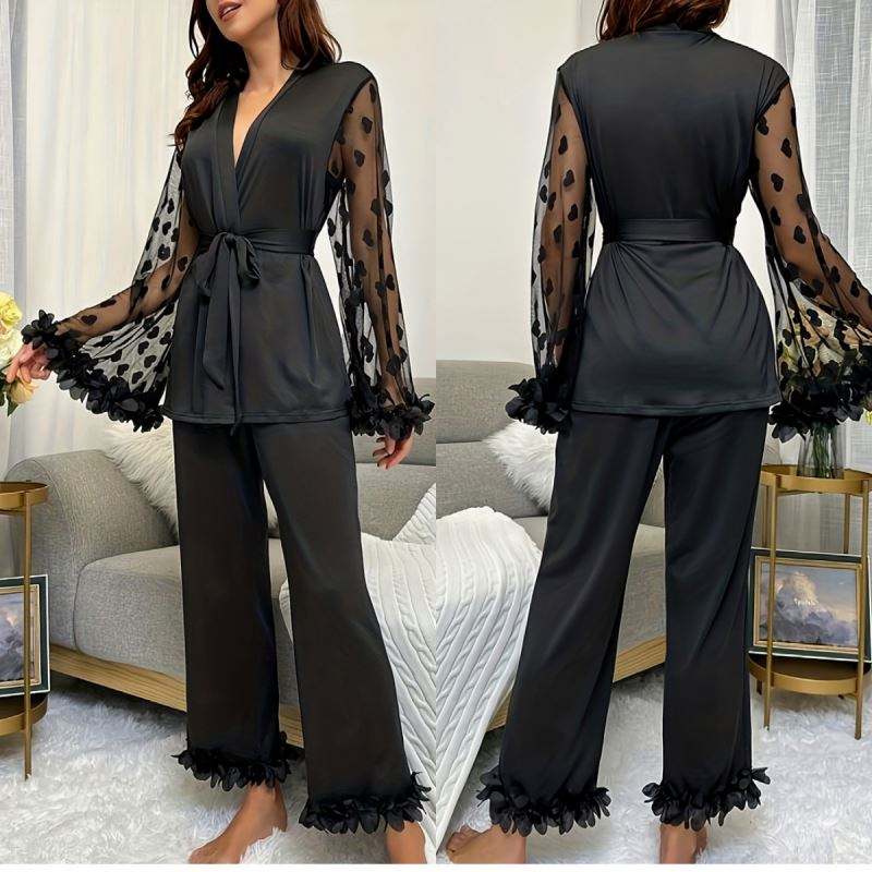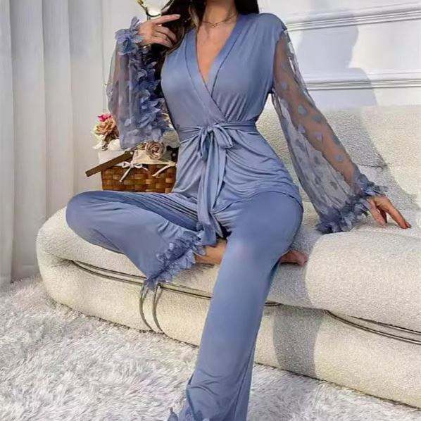 Sfy-y5108 2025 Conjunto de Pijama de Lujo de 2 Piezas para Mujer, con Cuello en V, Cintura Elástica, Largo Completo, de Spandex/Algodón, con Volantes de Encaje Transparente, para Invierno