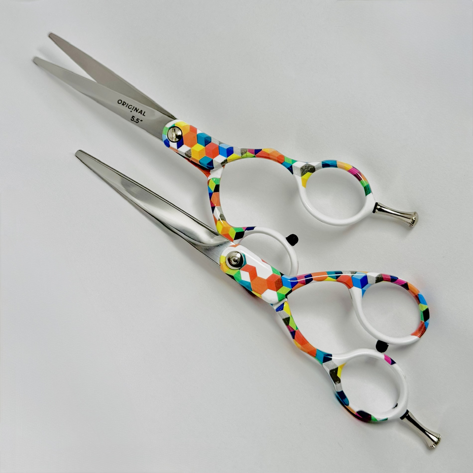 Tijeras de Peluquería Profesionales de 5.5 Pulgadas con Punta Afilada Personalizable, para Diestros, Borde Recto, Color Arcoíris, Acero Inoxidable de Titanio