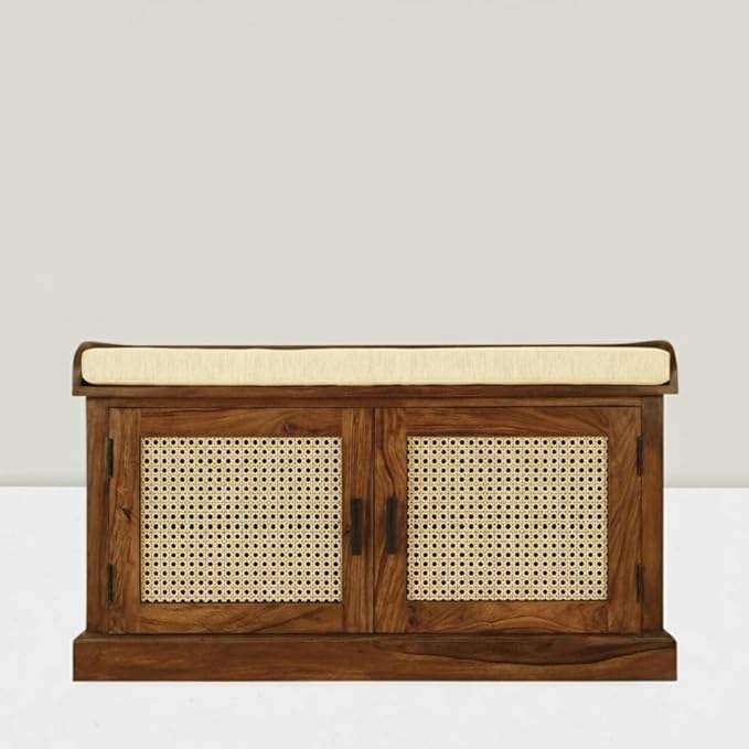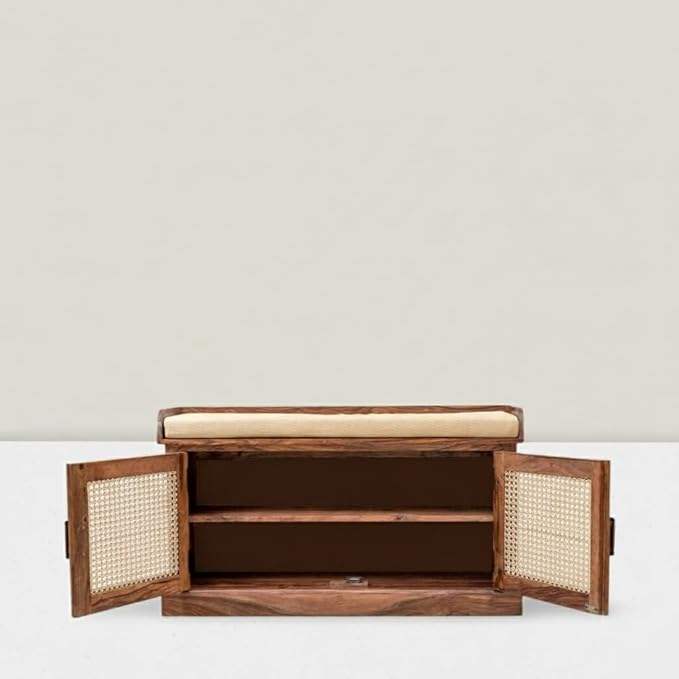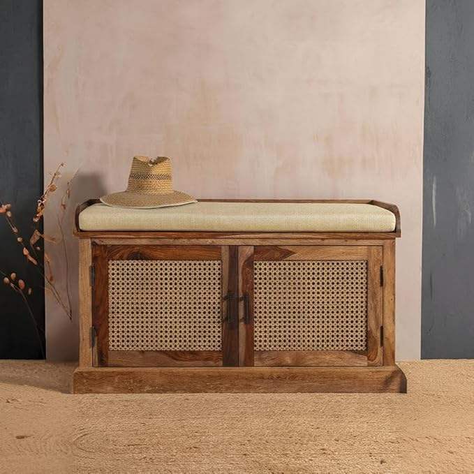 Zapatero de madera de Sheesham con puertas de mimbre, asiento superior acolchado, acabado en laca mate color miel, 105x35x60 cm, tradicional