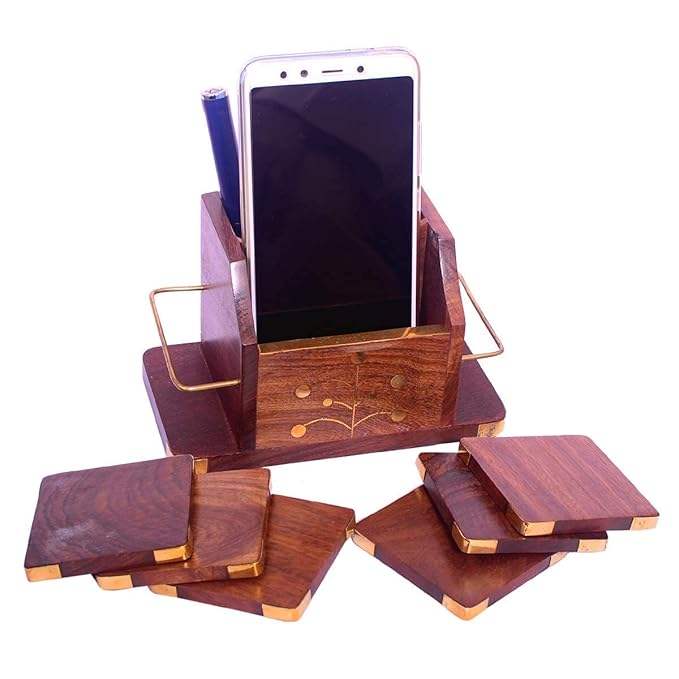 Posavasos de Madera de Sheesham, Soporte para Móvil, Portalápices, Organizador de Mesa Multiusos, Artículo de Regalo Hecho a Mano