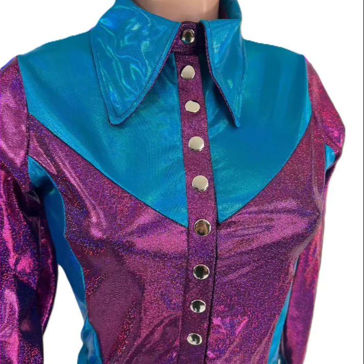 Camisa Brillante de Cintura Alta Estilo Western para Mujeres y Niñas, Color Rosa Metálico y Verde Azulado, Ligera, Transpirable, con Cierre de Botones
