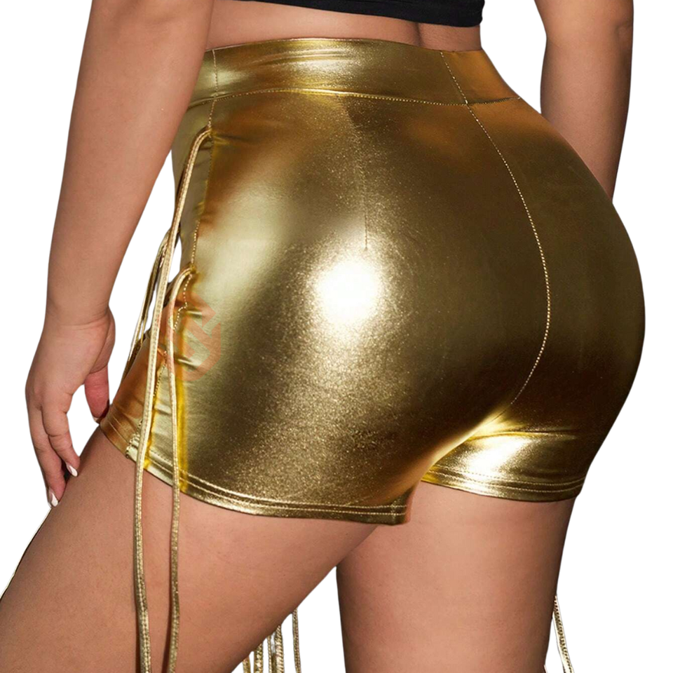 Pantalones cortos de cuero metálico brillante para mujer New Western Festival Genuine Sheep Hide Fringe Metallic Leather Short Dance Performance