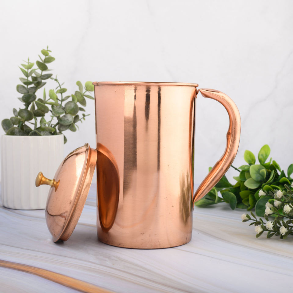 Jarra de jarra para vasos a prueba de fugas de cobre puro 100% de superficie lisa pulida brillante con vidrio para uso de vajilla de restaurantes domésticos