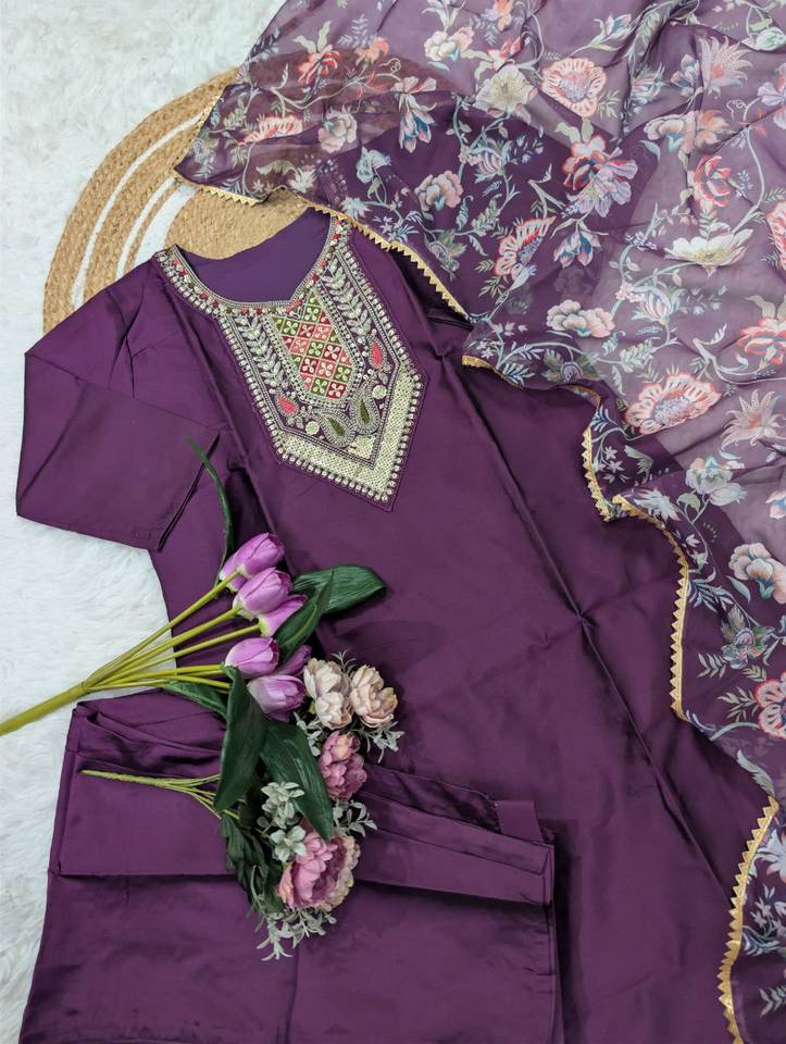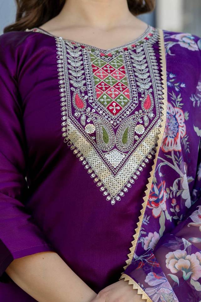 Compre Ahora el Conjunto Kurti y Pantalón de Algodón con Bordado Intenso en Color Morado, Diseño de Cuello Recto y Borde Decorativo, con Dupatta