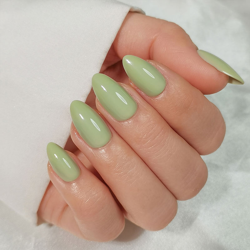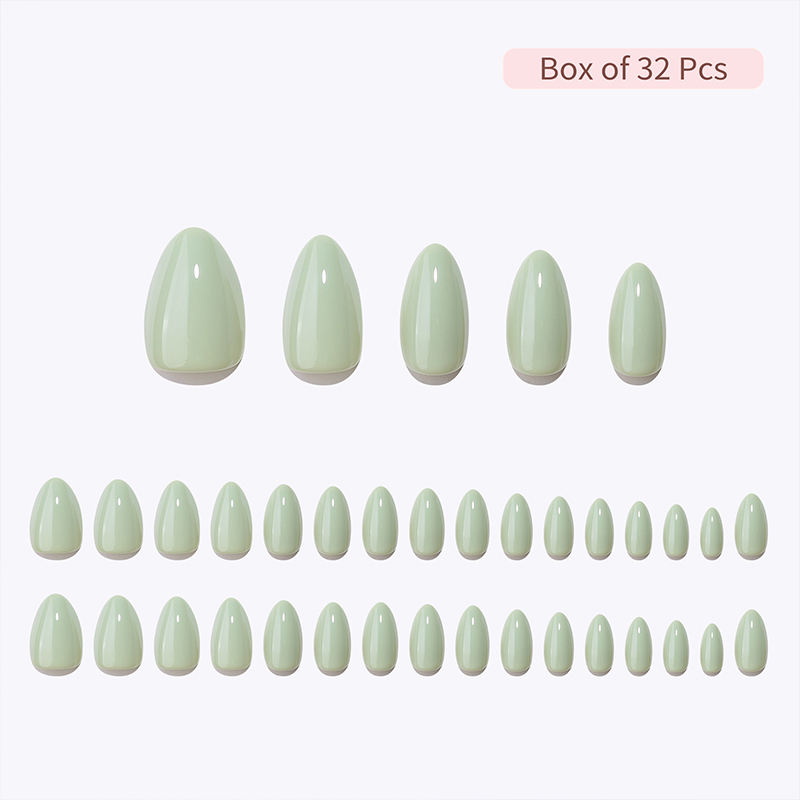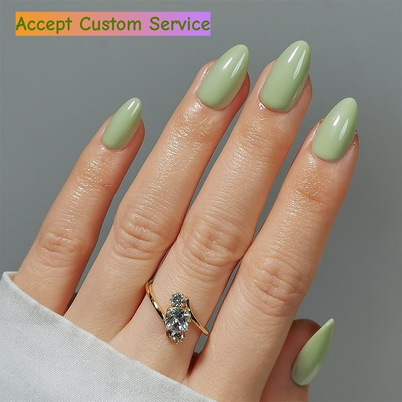 Juego de Uñas Postizas Reutilizables Cortas en Forma de Almendra, CPNP MSDS, Venta al por Mayor, Color Verde Claro, Uñas de Gel Suave, Uñas Artificiales a Presión, En Gros