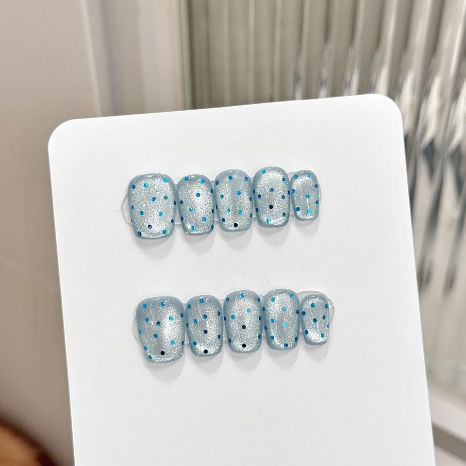 Escalera corta Diseño de dedo acrílico Prediseñado Tonos frescos Gris plateado con un sueño de chicle de belleza de hielo fresco nacarado