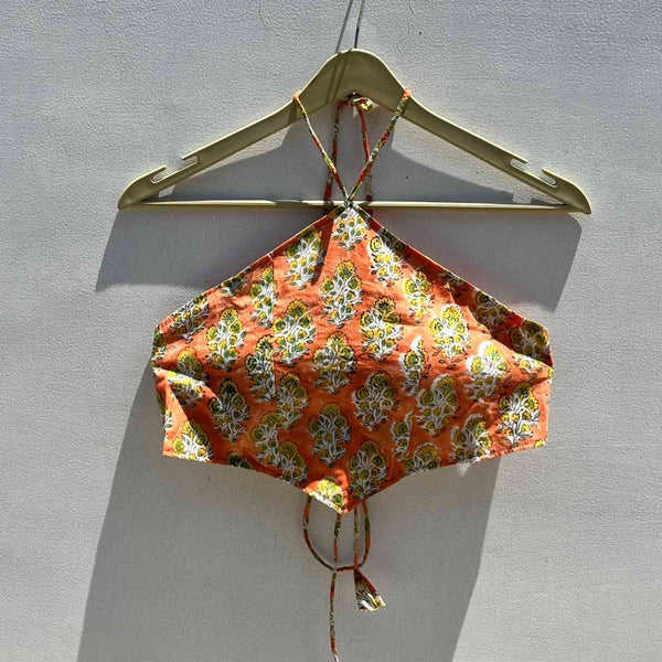 Top Corto de Algodón Tejido Color Durazno con Diseño Cruzado Estampado a Mano, Blusa sin Mangas con Estampado Floral Étnico para Festivales de Verano