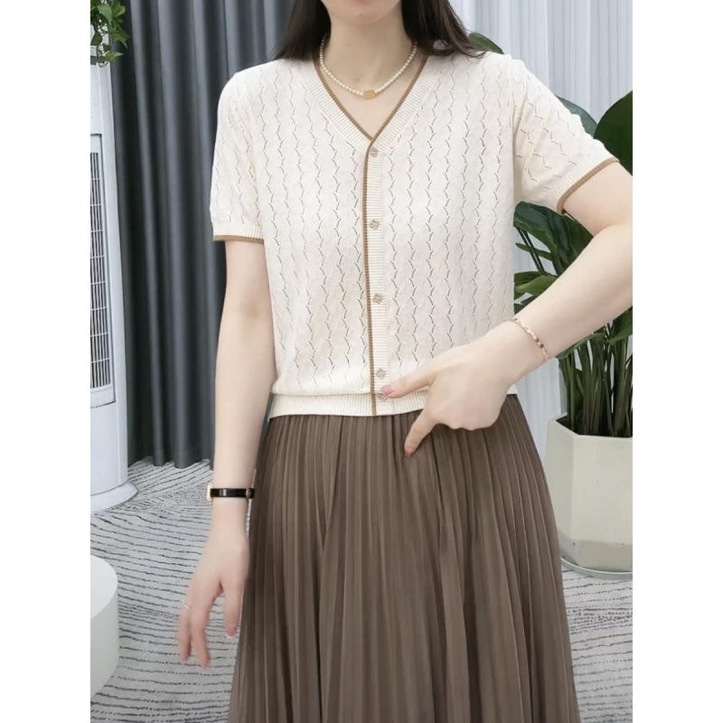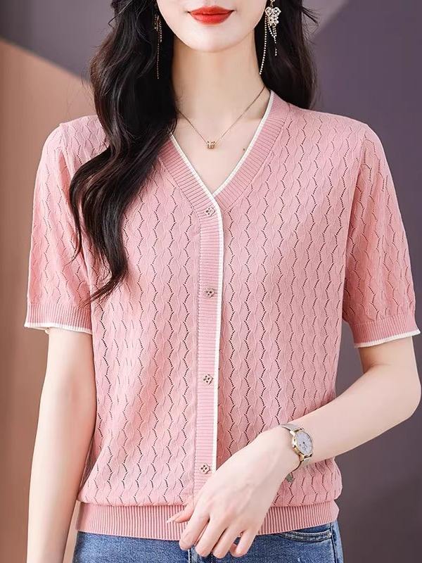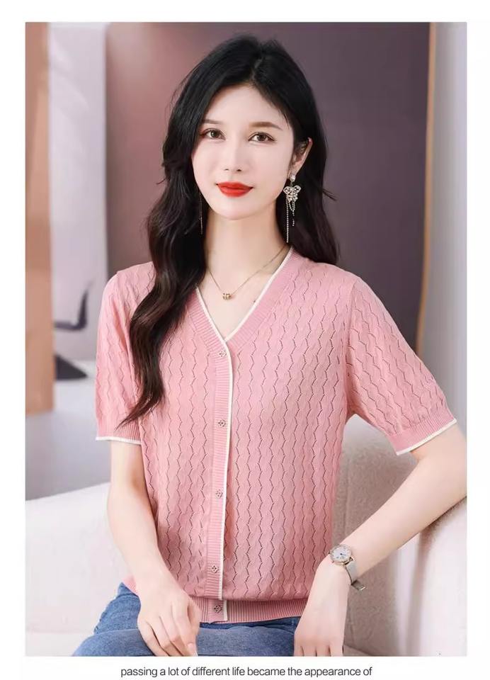 Nuevo suéter de verano con cuello en V de manga corta para mujer, camiseta suelta, parte inferior fina de seda helada