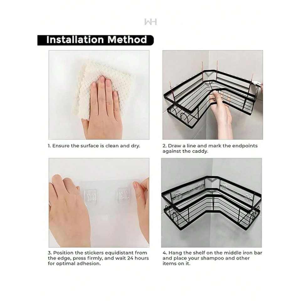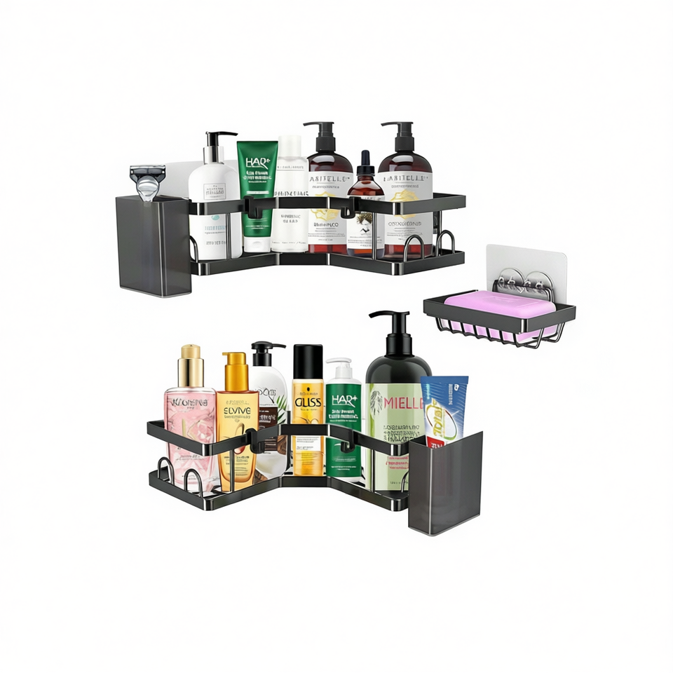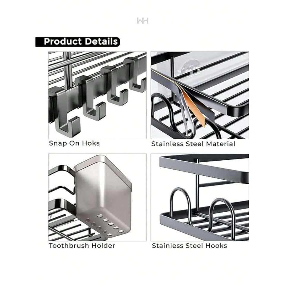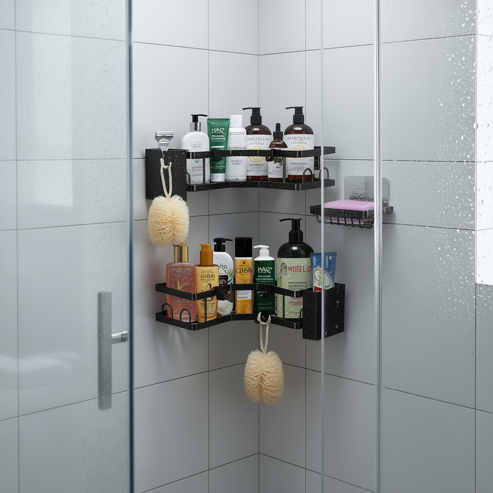 Moderno Organizador de Ducha Esquinero de Acero Inoxidable para Montar en la Pared con 4 Ganchos, Instalación sin Taladro, Almacenamiento de Baño de un Solo Nivel