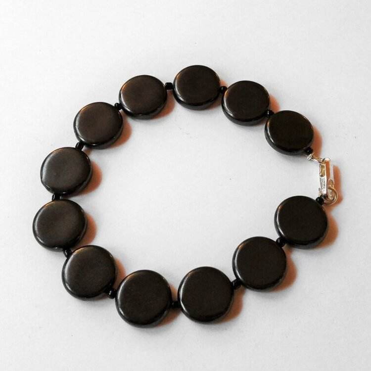 Pulsera Shungite 12 meses con 12 Cuentas planas redondas pulidas Ø 0,55 in (14mm) con cuentas de semillas negras, tamaño 16-17