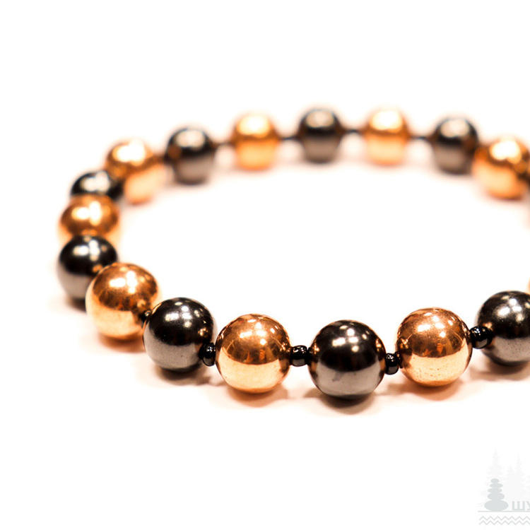 Pulsera shungita con 10 cuentas redondas pulidas Ø 0,32 in (8mm) y 10 cuentas redondas chapadas en cobre Ø 0,32 in (8mm), 1 sobre 1