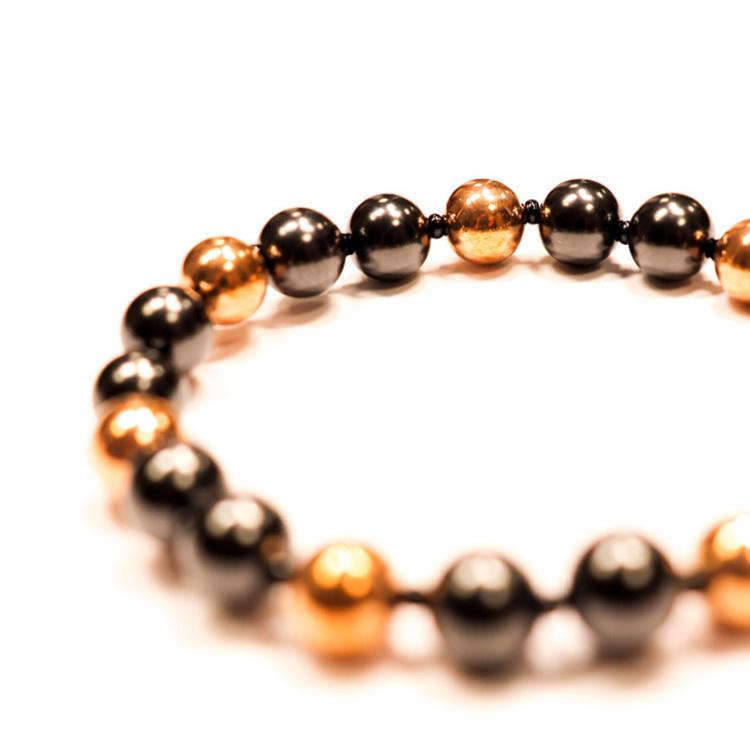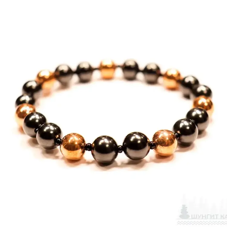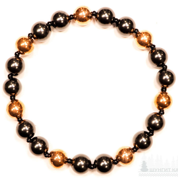 Pulsera shungita con 14 cuentas redondas pulidas Ø 0,24 in (6mm) y 7 Cuentas redondas chapadas en cobre Ø 0,24 in (6mm), 2 sobre 1 con