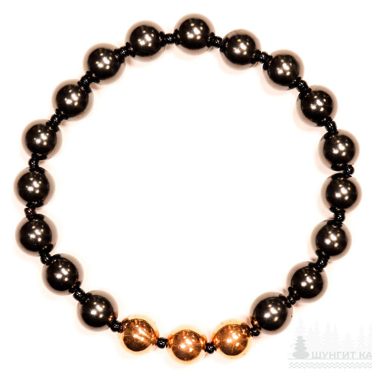 Pulsera Shungite con 17 Cuentas redondas pulidas Ø 0,32 in (8mm) y 3 cuentas redondas chapadas en cobre Ø 0,32 in (8mm) con negro