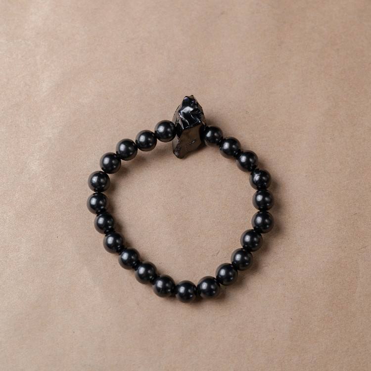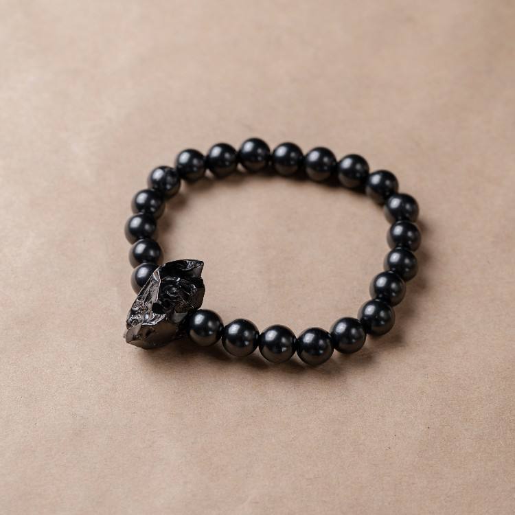 Pulsera Shungite con 22 cuentas redondas pulidas Ø 0,32 pulgadas (8mm) y 1 Cuenta de shungite élite caída en banda elástica, tamaño 16-17