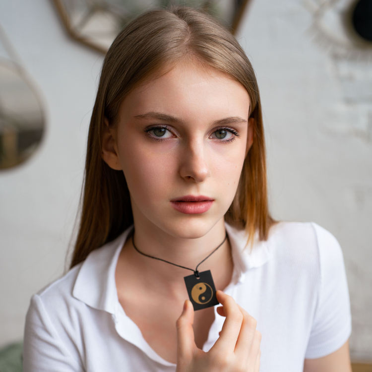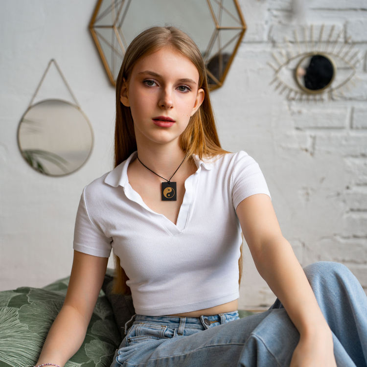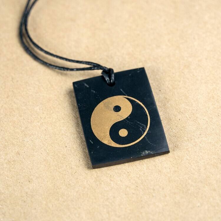 Colgante rectangular de shungita pulido con serigrafía Ying Yang 1.2*1.6 pulgadas (30*40 mm)