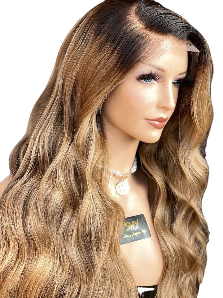 Shy 13x4 HD Peluca frontal de encaje transparente Pre arrancado Ombre Honey Blonde Highlights Pelucas de cabello humano crudo de color con raíz oscura
