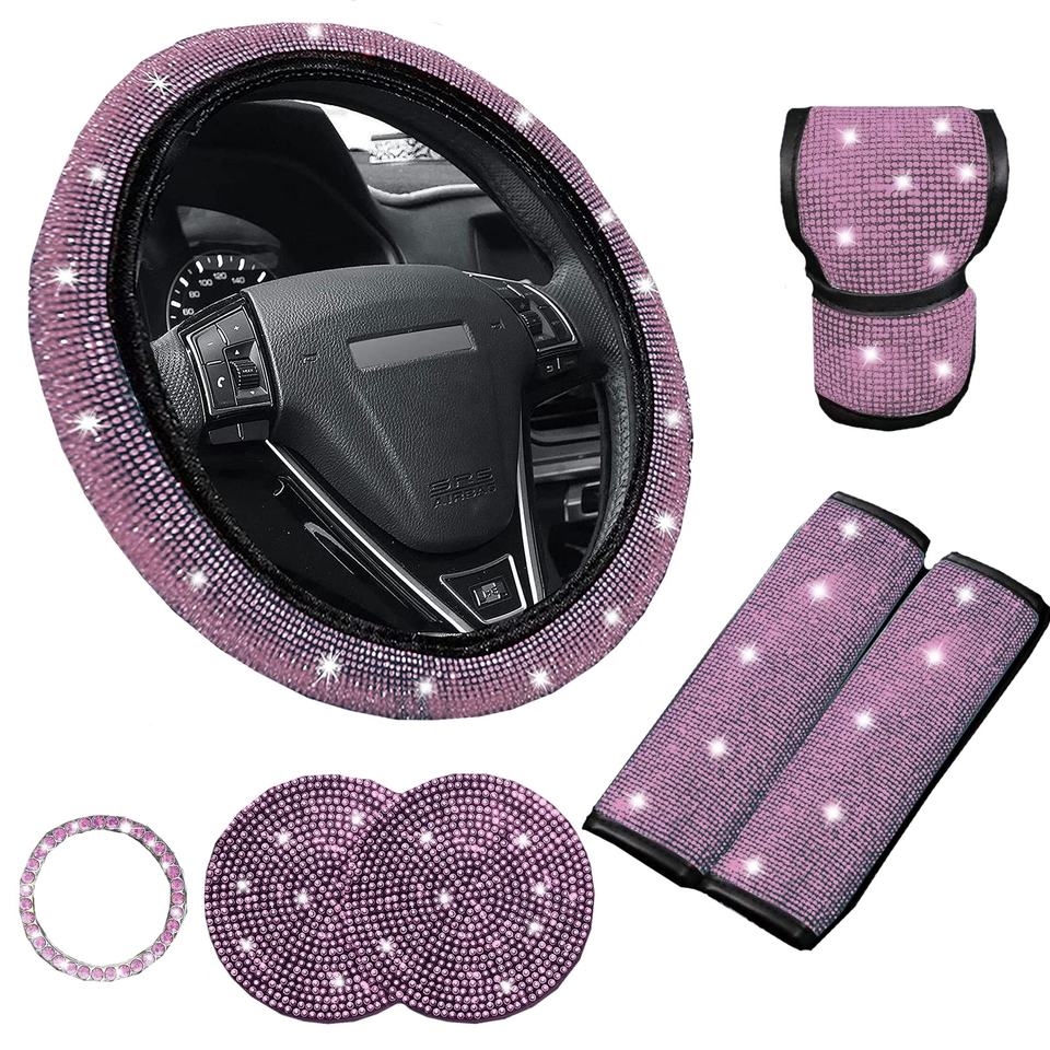 Juego de 4 Posavasos de Plástico Si Ran con Pedrería Brillante y Funda Universal de Seguridad para Volante de Coche de 4 Radios