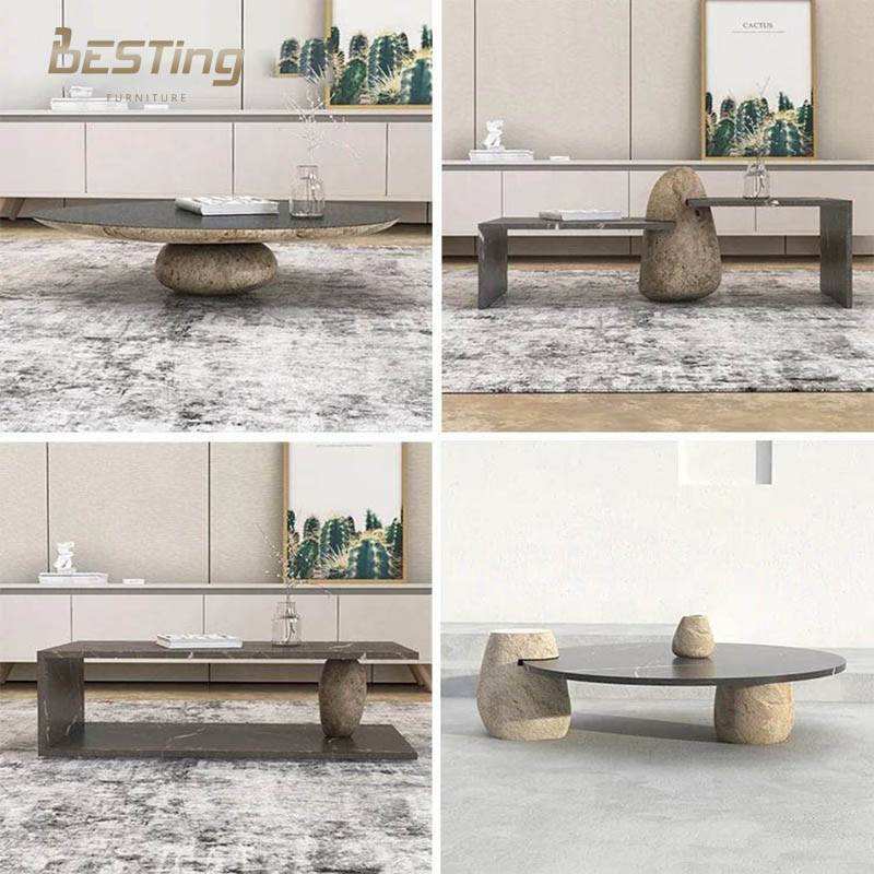 Mesa de Centro de Mármol Negro, Diseño de Piedra, Moderna, para Sala de Estar, Personalizada, de Piedra de Río, Redonda, Moderna