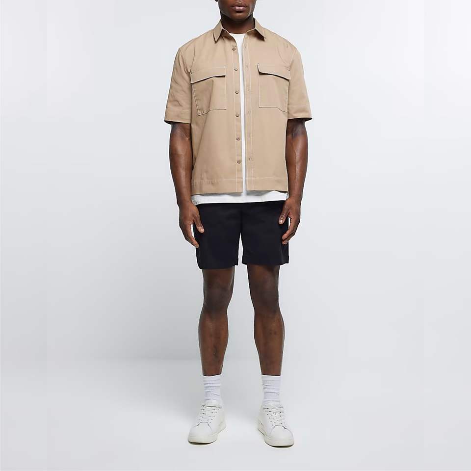 Cinturón con bolsillos laterales y cierre de cremallera, botones, 98% algodón, 2% elastano, negro, pantalones cortos ajustados, Chino