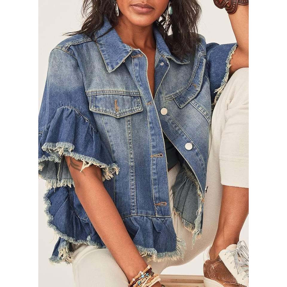 Chaqueta Vaquera Lavada con Volantes de Moda para Mujer, Manga Corta Informal con Botones, Estampado de Leopardo, Decoración con Lentejuelas y Diamantes