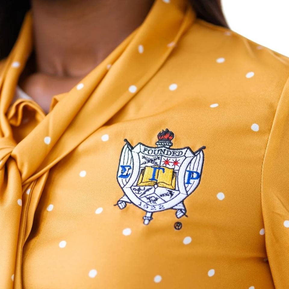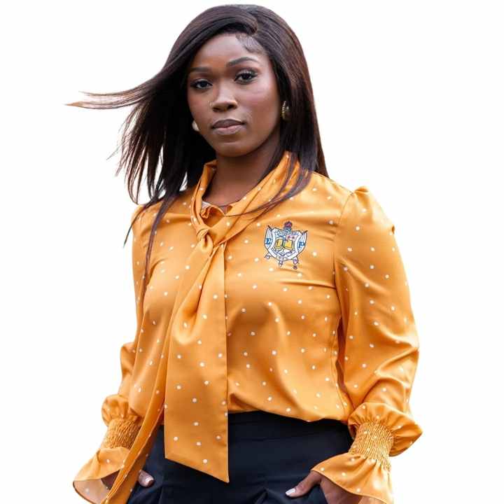 Blusa de lunares dorados Sigma Gamma Rho para mujer, camisa de manga larga con lazo, estilo casual elegante de la hermandad griega