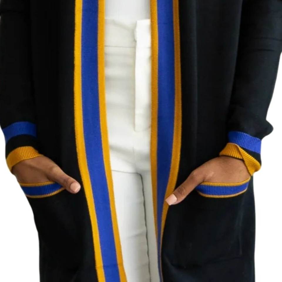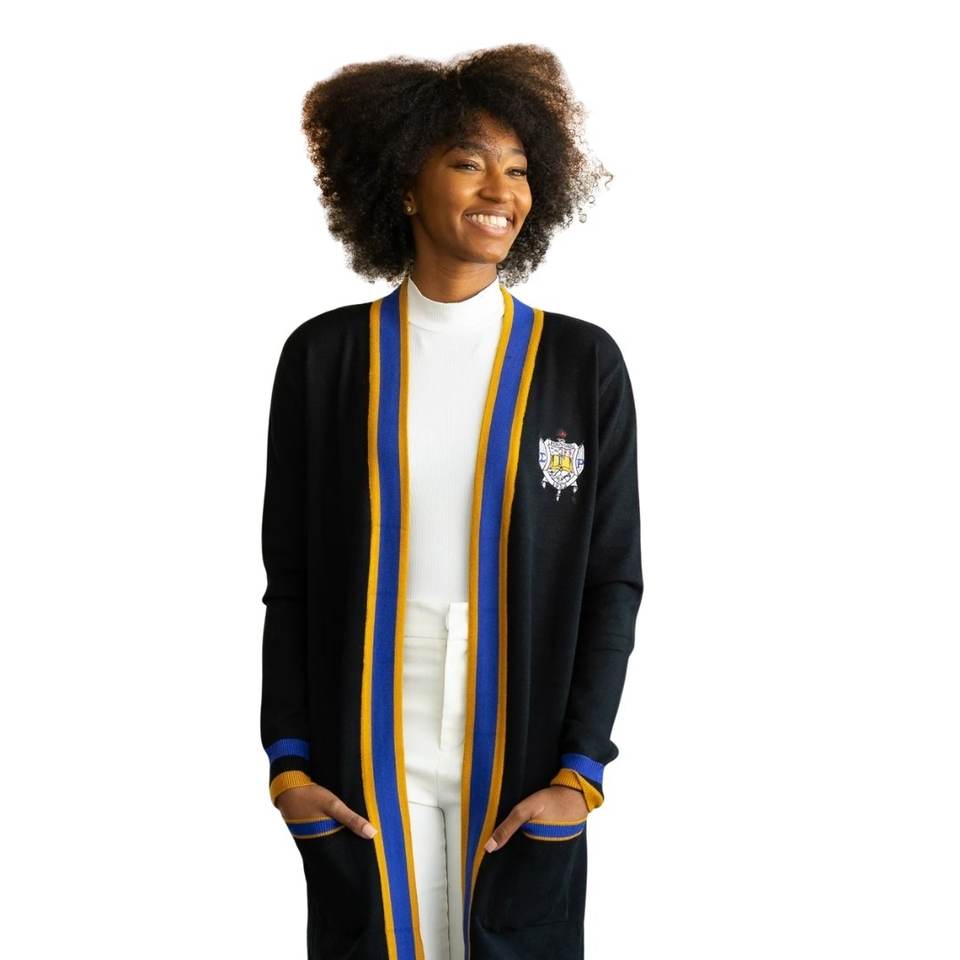 Cárdigan Largo Negro Sigma Gamma Rho para Mujer, Suéter de Punto con Ribete Dorado, Estilo Casual Elegante de la Hermandad Griega