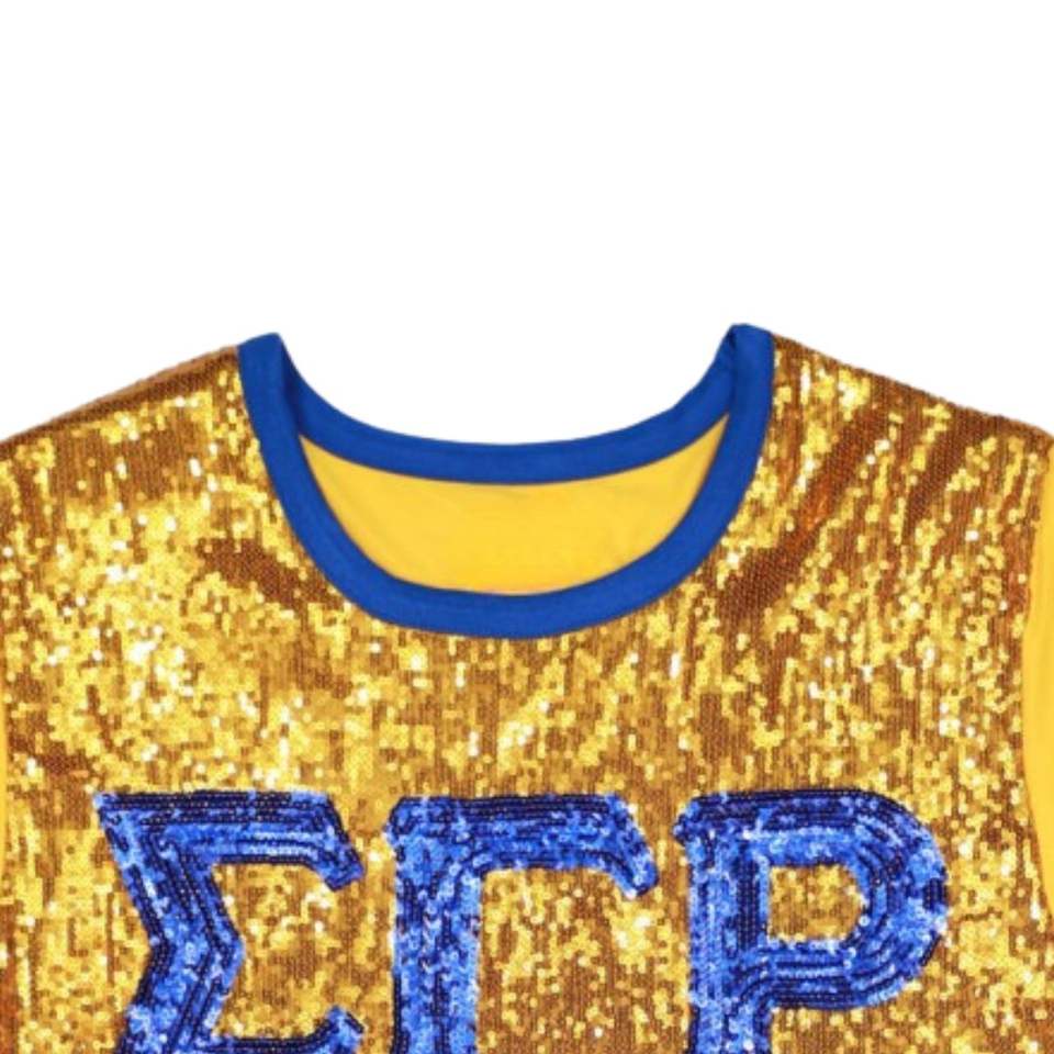 Camiseta de lentejuelas Sigma Gamma Rho SGRho, camiseta de moda de vida griega bordada con letras griegas azules doradas y brillantes