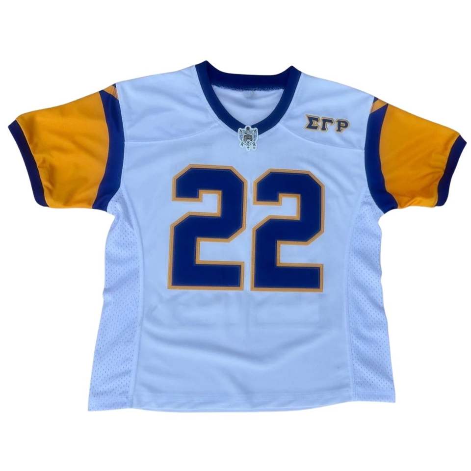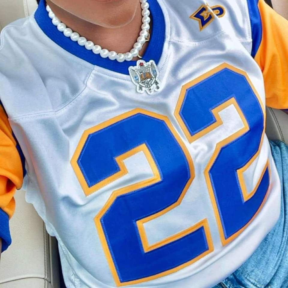 Camiseta de Fútbol Blanca Sigma Gamma Rho 22 Poodles Premium Azul Dorado Ropa Griega para Mujer