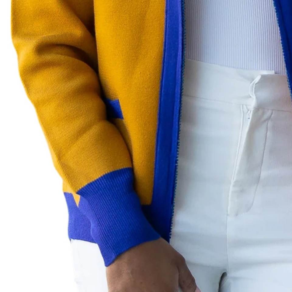 Suéter Cárdigan Amarillo y Azul Sigma Gamma Rho para Mujer, Cuello en V, Estilo Premium, Manga a Rayas, Ropa Casual de la Hermandad Griega