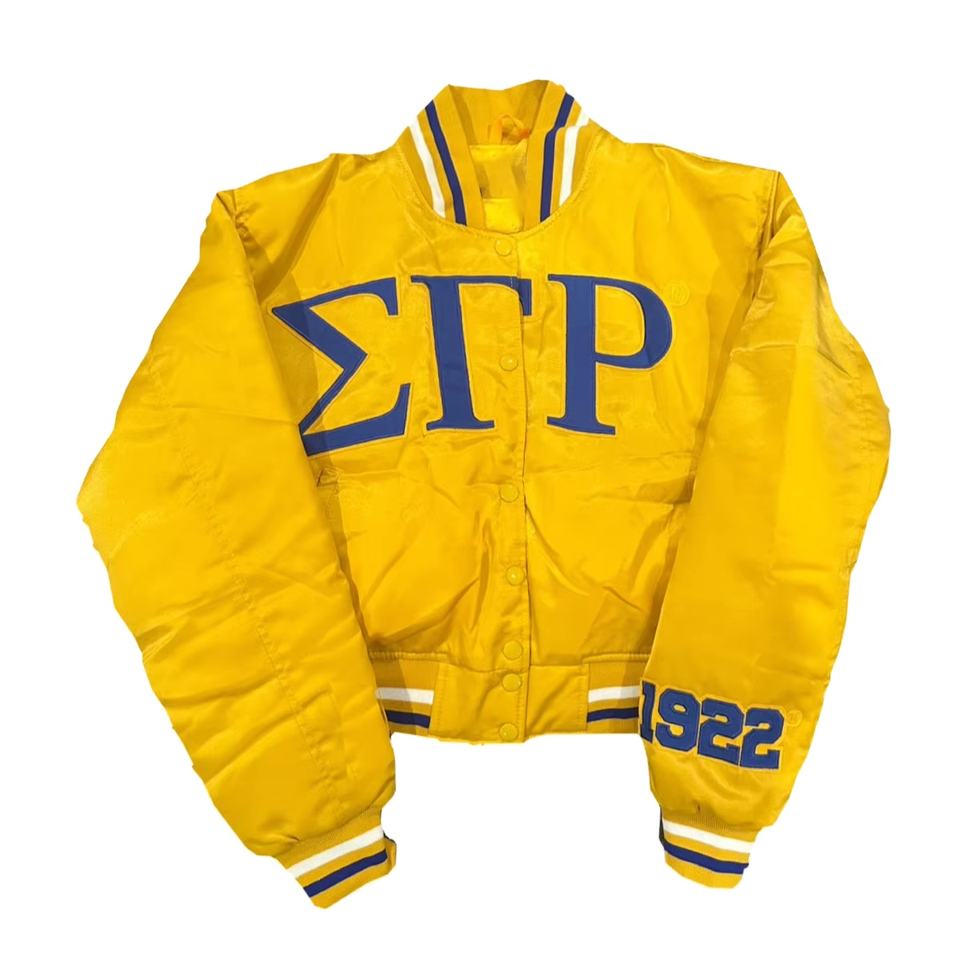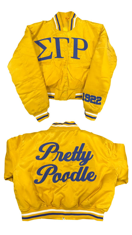 Chaqueta Bomber de Satén Griega Sigma Rho Phi SGRHO Pretty Poodle Sorority Sisterhood para Mujer, Chaqueta Bomber Corta, Chaqueta de Línea Griega