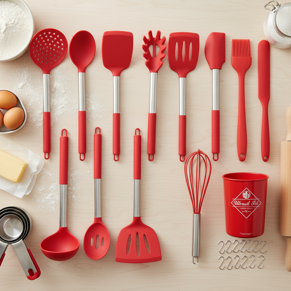 Utensilios de Cocina de Silicona, Juego de Utensilios de Goma con Soporte para Espátula, Cuchara y Espátula