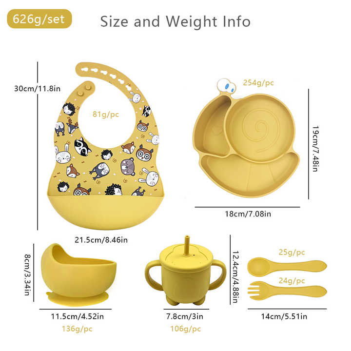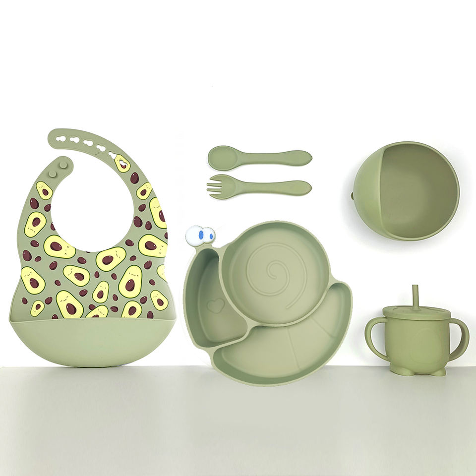 Set de Alimentación de Silicona con Baberos con Diseño, Plato de Caracol y Vaso con Pajita para Bebés, Set de Vajilla Impermeable para Bebés